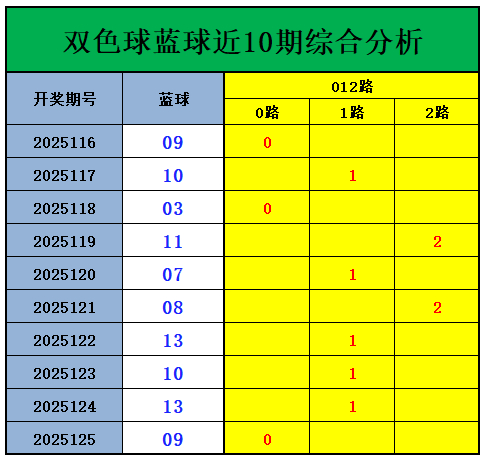 上期开出0路号码09,近十期0路号码开出3个,1路号码开出5个,2路号码开出2个;1路号码走势较热,2路号码表现较冷,上期开出0路奖号,本期关注2路蓝球,重点关注:05