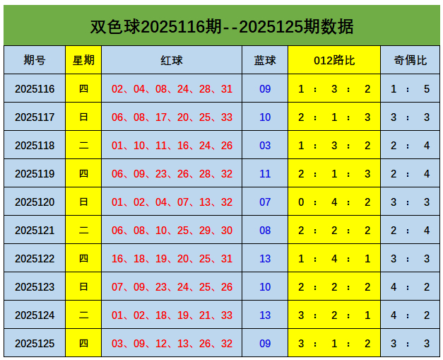 上期回顾:双色球第2025125期开出奖号:红球03、09、12、13、26、32;蓝球09,其中红球012路比为3:1:2,奇偶比3:3,蓝球开出三区号码09。