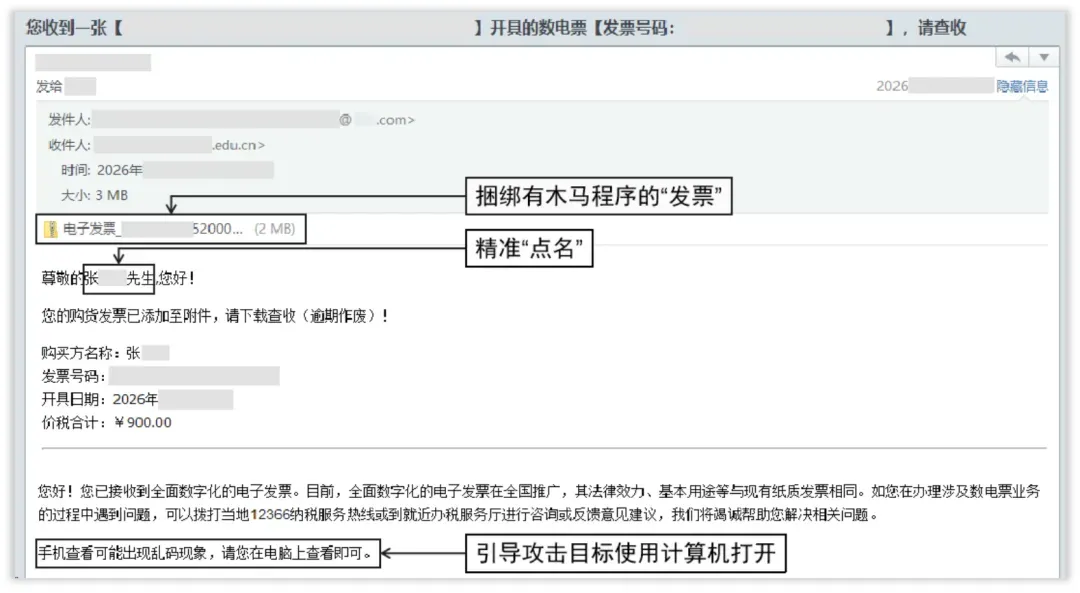 这类邮件伪装度极高,不仅精准使用实名称呼,还在邮件中注明“逾期作废”“手机查看可能出现乱码,请在电脑上查看”等诱导性文字,邮件内容、附件名称与正规电子发票几乎完全一致,极具迷惑性。
